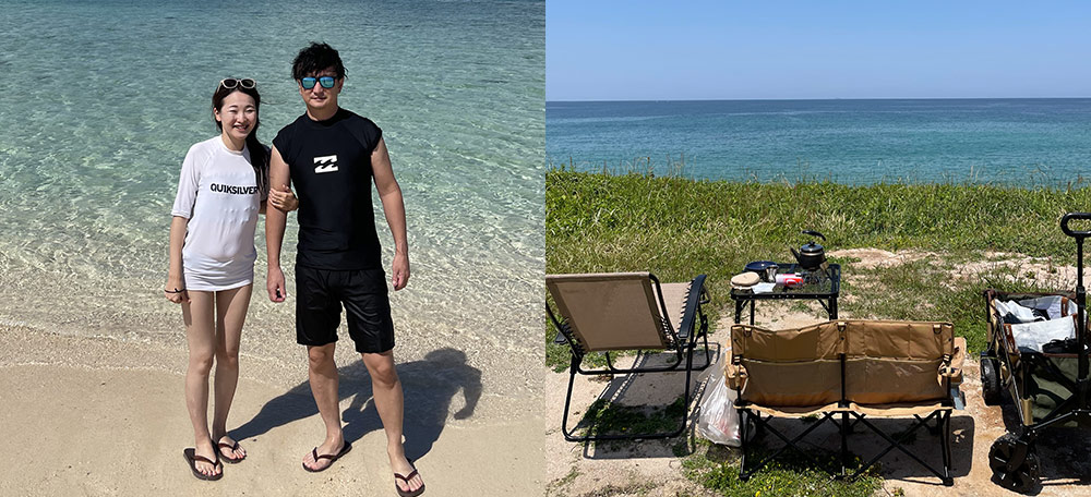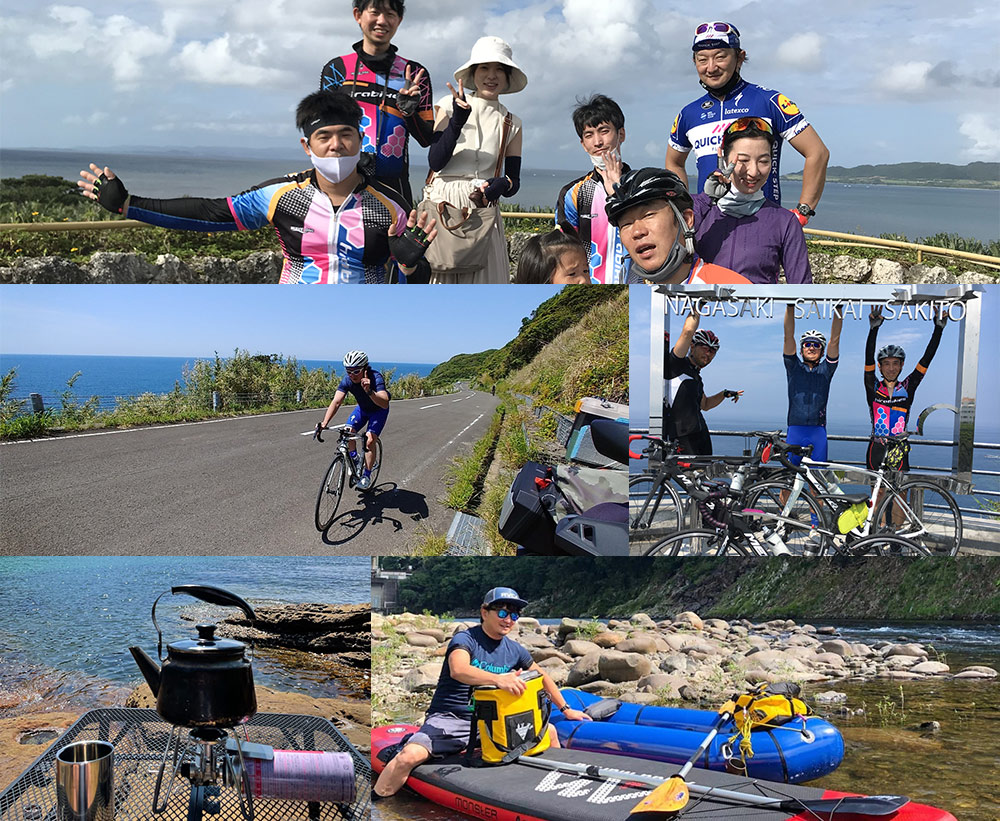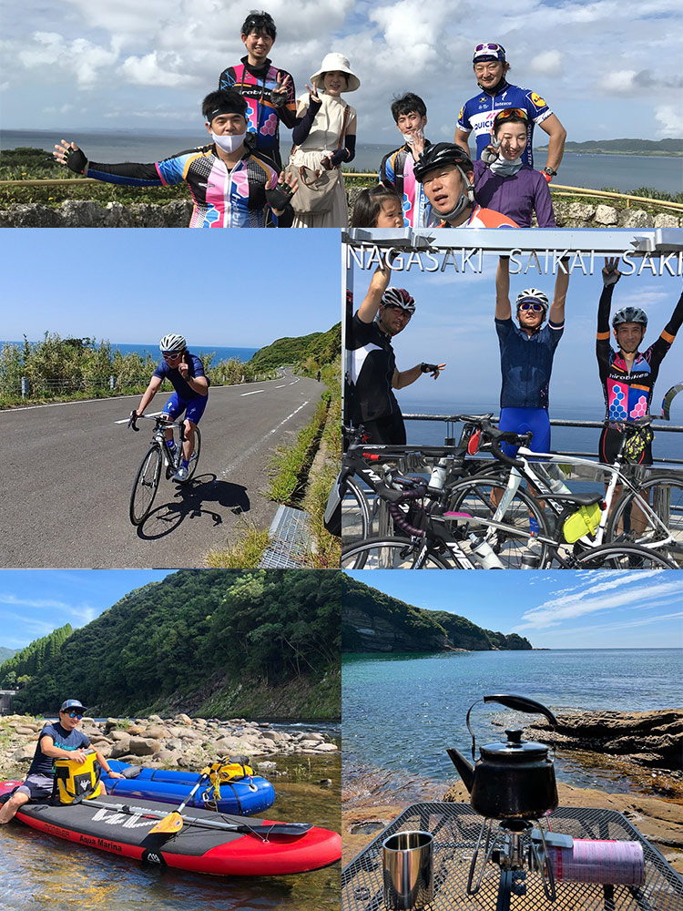 陸ではキャンプ、ライフガード時代にトライアスロン競技を通じて出会ったロードバイク、海では佐賀や長崎まで車で足を伸ばしSUP(スタンドアップパドルとよばれる、サーフィン用よりも大きなボードに立って専用のパドルで漕ぎ進むスポーツ)を楽しむなど、アクティブ一辺倒だ。