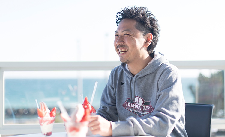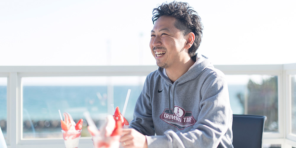 撮影を終えた帰路、海岸沿いに続く通称「いちごロード」にあるカフェに休憩のため立ち寄った。太平洋の水平線を望む2階のテラスで、名物のストロベリーパフェを「スウィーツ系はどうも苦手で」と、はにかみながら頬張る。「いい感じのお店ですね。今度家族を連れてこようかな」宮坂は晴れた日の午後の海辺の日差しに目を細めた。そして、自らのアイデンティティである家族と過ごす、この土地ならではの穏やかな時間を想像したのか、静かに微笑んだ。 (了)