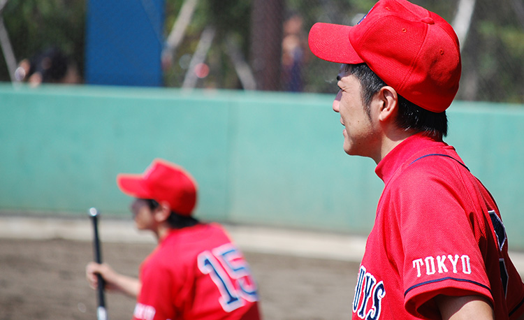 今日この場所を訪れたのは、職場の同僚で結成された赤いユニフォームのチーム、その名も「歌舞伎町ゴールデンガイズ」で監督兼2番・セカンドを務める大島拓矢に話を聞くためだ。