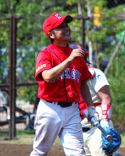 毎年夏に仕事関係先の企業が参加して開催される野球大会「京王杯」で優勝し、目に焼き付くような赤が印象的な現在のユニフォームを会社にあつらえてもらった。